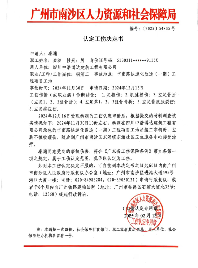 我局依法受理了劳动者秦渊的工伤认定申请,现依据《广东省工伤保险基金省级统筹业务规程》第一百零三条的规定,向用人单位四川中浩博达建筑工程有限公司(统一社会信用代码:91510100MA6DERKN5B,企业地址:成都市青羊区北大街19号3栋7层712号),法定代表人:刘海亮)公告送达《认定工伤决定书》1份。自本公告发出之日起,经过六十日,即视为送达。