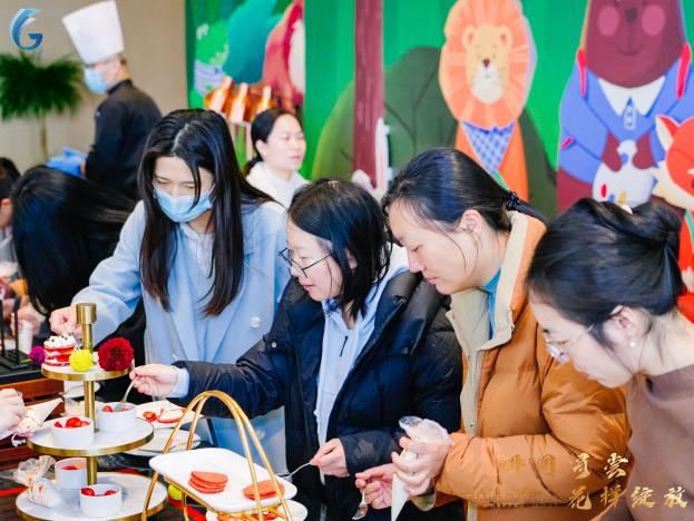 甜品DIY体验更是甜蜜诱人。星级甜品师现场指导红丝绒蛋糕的制作,女职工们亲手完成夹馅、装饰等步骤,将创意融入甜蜜,展现了女性的巧思与创造力。