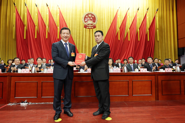 区人大常委会主任张谭均(右)向区人民政府区长曾进泽颁发当选通知书