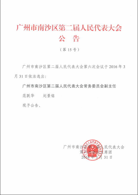 广州市南沙区第二届人民代表大会公告(第15号)