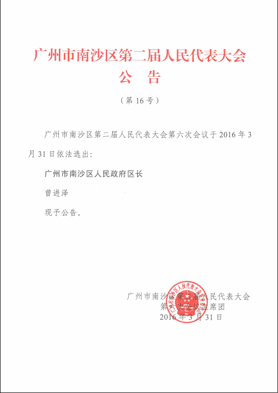 广州市南沙区第二届人民代表大会公告(第16号)