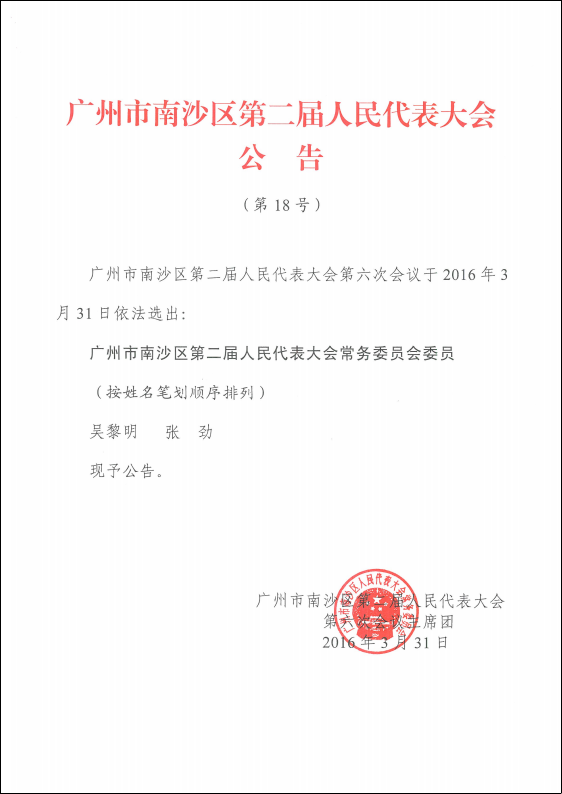 广州市南沙区第二届人民代表大会公告(第18号)