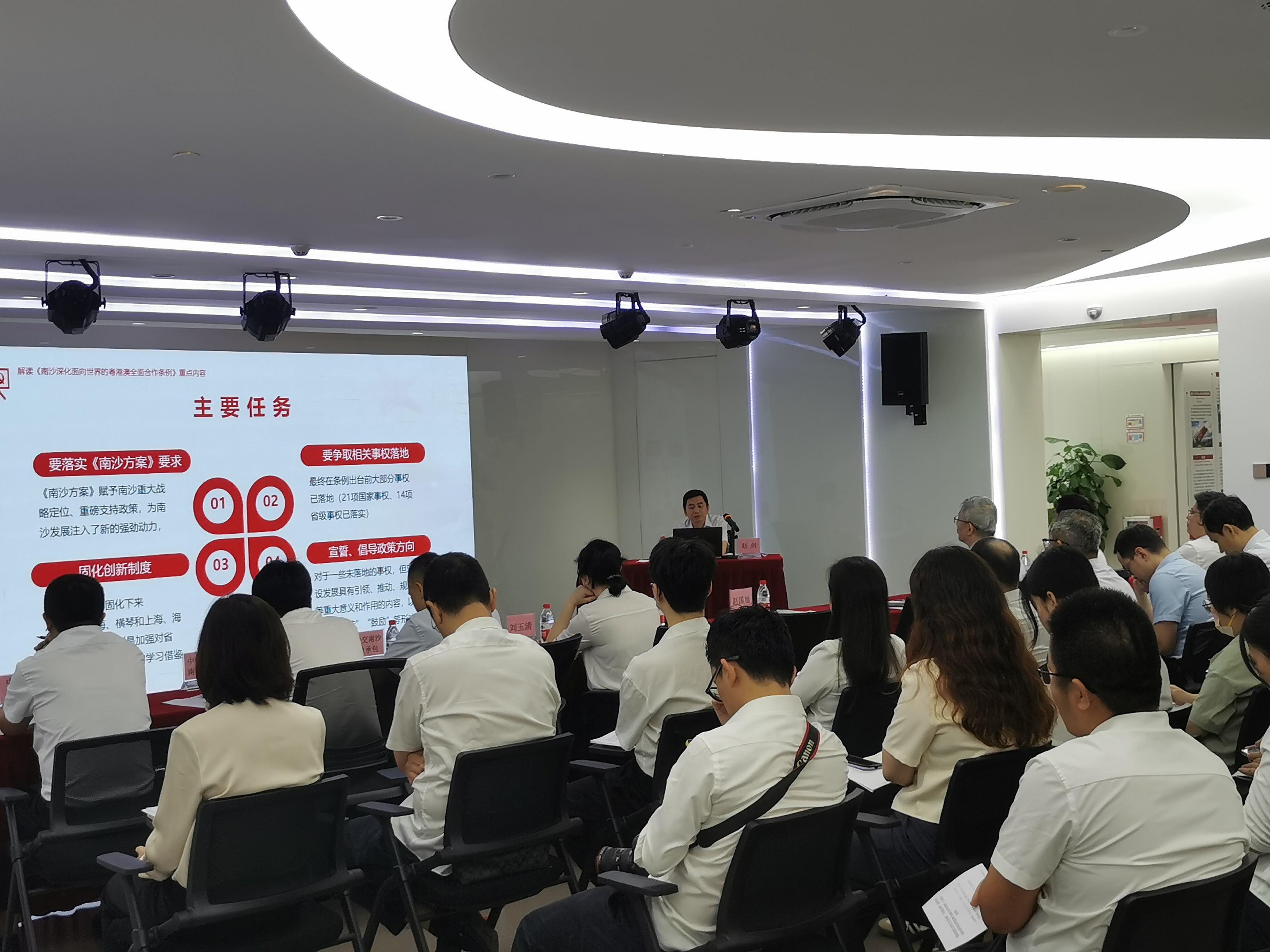 2024年4月3日上午,南沙区人大常委会党组副书记、副主任赵剑同志在明珠湾红色驿站二楼多功能会议厅,为“明珠湾建设者红色基地”成员单位(中交南沙总承包部党支部、中铁隧三处粤港澳大湾区指挥部党工委、中铁建南沙投资发展有限公司党委、中铁广州工程局集团第二工程有限公司党委、中国能建葛洲坝南沙区域党组织、中铁建南方工程有限公司党委)解读宣讲《南沙深化面向世界的粤港澳全面合作条例》,对该条例的立法背景、制定依据、研究过程与具体条款进行了深入浅出的讲解,并对明珠湾区如何应用条例规定更好地全面推动高质量发展提出了工作要求与建议。明珠湾管理局及“明珠湾建设者红色基地”六大央企单位主要负责人、党员代表、业务骨干共50多人参加了宣讲会。