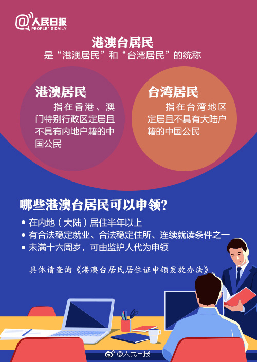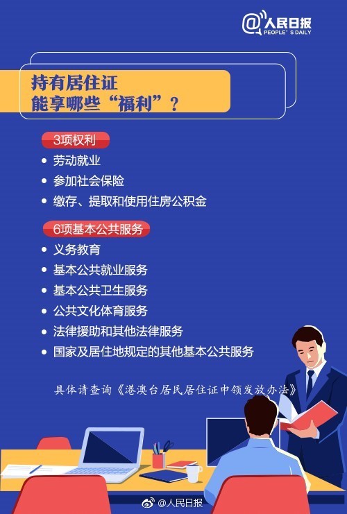 据介绍,符合申领条件的港澳台居民,根据本人意愿,可以申请领取居住证。办理居住证的港澳台居民,可在居住地享受劳动就业、参加社会保险、依法缴存提取和使用住房公积金等3项权利以及义务教育、基本公共就业服务、基本公共卫生服务、公共文化体育服务、法律援助和其他法律服务等6项基本公共服务。