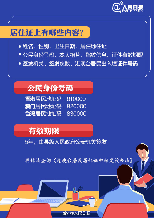 第三条 港澳台居民居住证登载的内容包括:姓名、性别、出生日期、居住地住址、公民身份号码、本人相片、指纹信息、证件有效期限、签发机关、签发次数、 公民身份号码由公安机关按照公民身份号码国家标准编制。香港居民公民身份号码地址码使用810000,澳门居民公民身份号码地址码使用820000,台湾居民公民身份号码地址码使用830000。