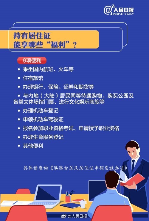 同时,办理居住证的港澳台居民,还可享受在居住地办理机动车登记,申领机动车驾驶证,报名参加职业资格考试、申请授予职业资格,办理生育服务登记以及在内地(大陆)住宿旅馆,乘坐国内航班、火车等交通运输工具,办理银行、保险、证券和期货等金融业务,与内地(大陆)居民同等待遇购物、购买公园及各类文体场馆门票、进行文化娱乐商旅消费等9项便利。