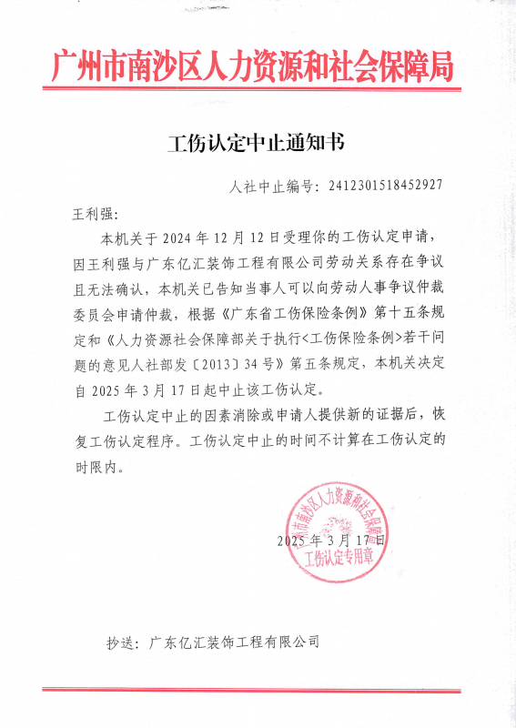 广州市南沙区人力资源和社会保障局依法受理了劳动者王利强的工伤认定申请,现依据《广东省工伤保险基金省级统筹业务规程》第一百零三条的规定,向用人单位广东亿汇装饰工程有限公司(统一社会信用代码:91440605MA7GW65M7R,企业地址:佛山市南海区狮山镇白沙桥工业区10号商铺(住所申报),法定代表人:缪利民)公告送达《工伤认定中止通知书》1份。自本公告发出之日起,经过六十日,即视为送达。
